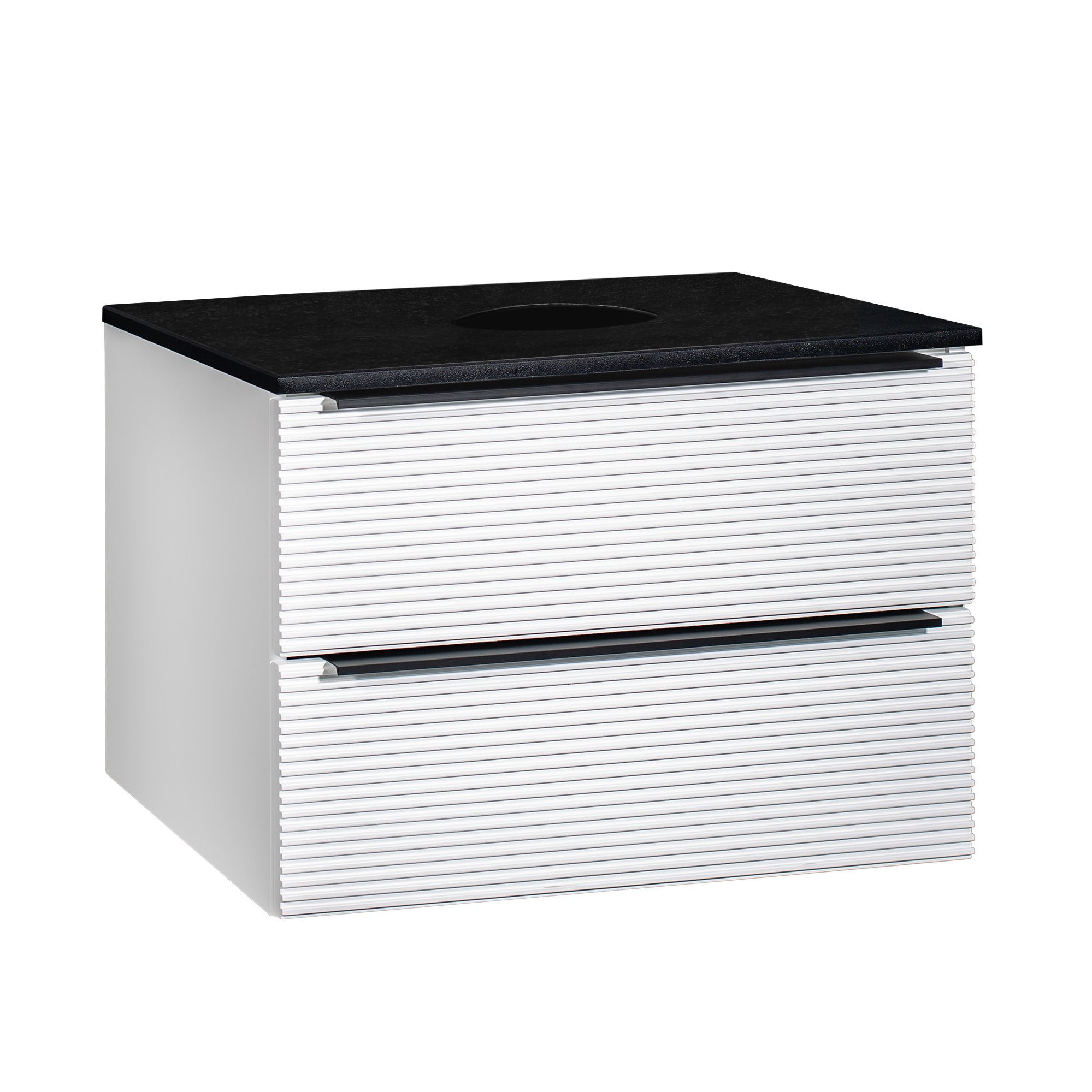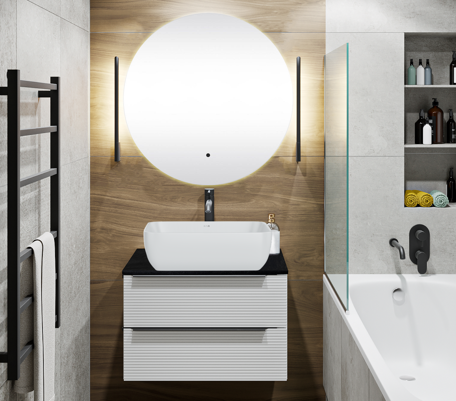Тумба под раковину в ванную RUNO Орлеан (подвесная) – это изысканность и утончённая роскошь в интерьере. Рифленые фасады визуально «оживляют» и «приводят в движение» всю обстановку комнаты, сохраняя при этом умиротворение и покой. Цвета корпуса и фасада имеют идеальное классическое цветовое сочетание белого и чёрного цветов, которые идеально впишутся в любой интерьер ванной комнаты. Тумба в ванную оснащена двумя выдвижными ящиками на шариковых направляющих, оснащенных системой плавного закрывания. В комплекте входят: две металлические ручки, навесы для крепления к стене. К тумбе для ванной подойдут умывальники на столешницу: «OVALE 50» (50х36см) - идеальное решение для стильного интерьера ванной, создан для минималистичных интерьеров и подойдёт для санузлов в стиле лофт, минимализм и хай-тек. Строгая овальная геометрически правильная форма раковины, усиливает идею лаконичности в дизайне, устанавливается на столешницу, накладным методом. «PALLA D41» (диаметр 41см) - идеальное решение для стильного интерьера ванной, создан для минималистичных интерьеров и подойдёт для санузлов в стиле лофт, минимализм и хай-тек. Строгая круглая геометрически правильная форма раковины, усиливает идею лаконичности в дизайне, устанавливается на столешницу, накладным методом. «TRE 48» (48х37см) - идеальное решение для стильного интерьера ванной, создан для минималистичных интерьеров и подойдёт для санузлов в стиле лофт, минимализм и Хай-Тек. Строгая прямоугольная форма с округлыми углами усиливает идею лаконичности в дизайне, устанавливается на столешницу, накладным методом. «TERZO 60» (59х39см) - идеальное решение для стильного интерьера ванной, создан для минималистичных интерьеров и подойдёт для санузлов в стиле лофт, минимализм и хай-тек. Асимметричная раковина, которую можно установить любой стороной, дизайнерское решение для нестандартных интерьеров, усиливает идею лаконичности в дизайне, устанавливается на столешницу, накладным методом. И другие накладные раковины бренда RUNO.